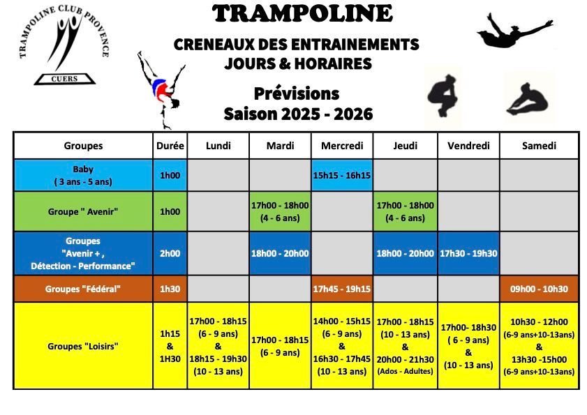 Pour les majeurs, certificat médical de moins de 3 mois à l'inscription, avec mention "apte à la pratique du trampoline y compris en compétition"